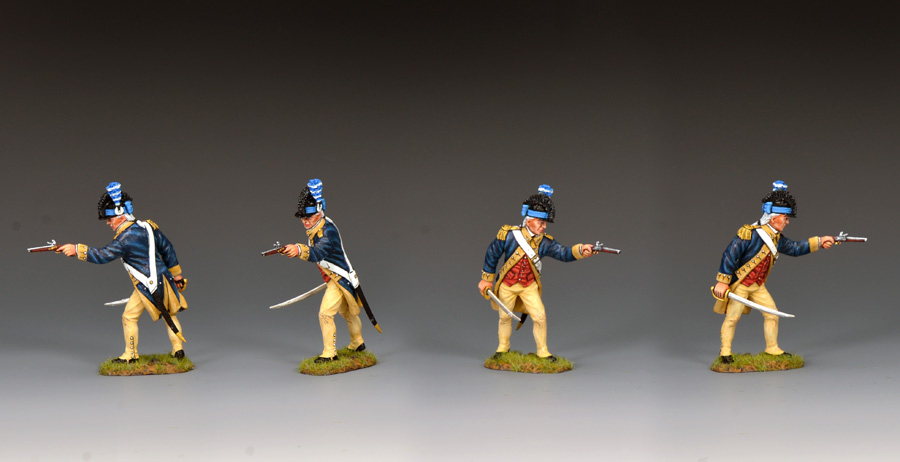 Standing four-square with his men this non-commissioned officer fires his pistol at the advancing 'Redcoats' while also preparing to meet them with some cold steel.