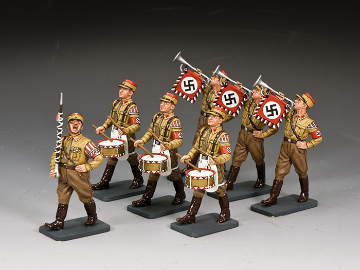 This compact 7 x figure set contains three side drummers and three trumpeters led by a bellowing SA Drum Major. All together in their specially – designed box.