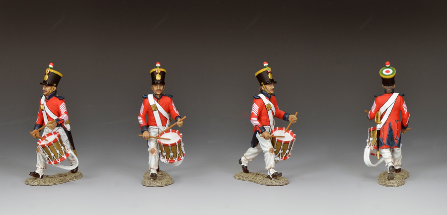Wearing the 'reverse colours' of this Mexican regiment the drummer keeps up a stead beat as he leads his regiment forward.