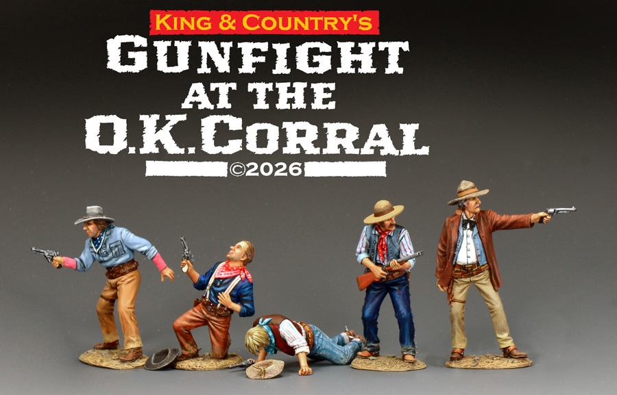 Billy Clanton and Tom McLaury have both been hit while Frank McLaury steps forward, pistol arm extended, soon he too will be a fatal casualty.